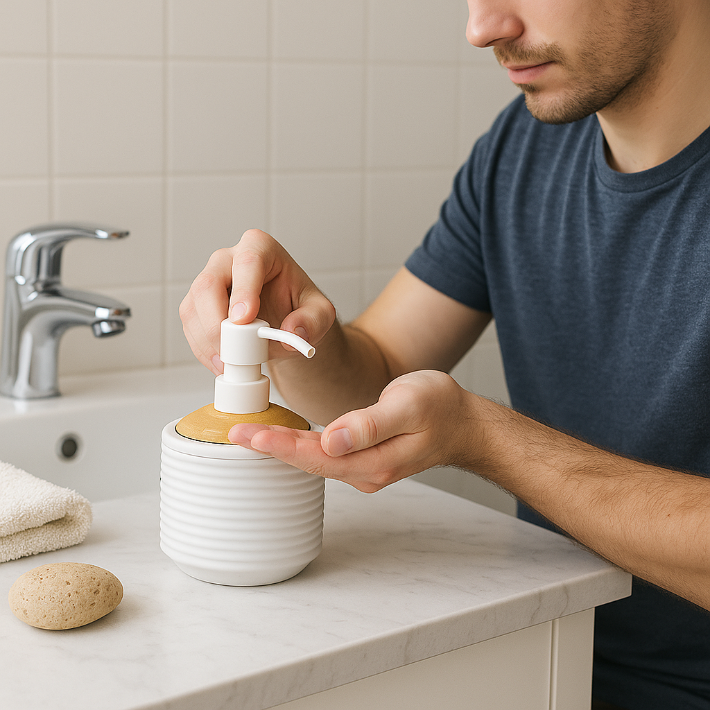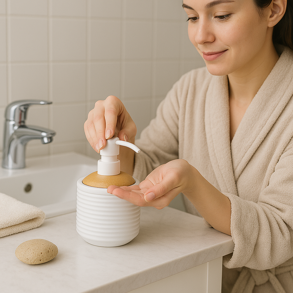 Elegant metal soap dispenser with pump design. Rust-resistant finish, durable construction. Perfect for modern bathroom and kitchen décor.